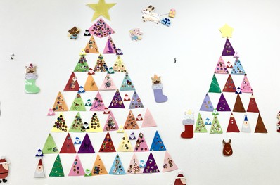子どもたちが作った小さなツリーを組み合わせ、大きなツリーにして廊下に飾っていますので、お立ち寄りの際はぜひご覧ください(≧▽≦)