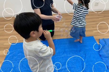こんにちは🌞大分ルームです! 夏休みも終盤を迎え、もう少しで2学期が始まりますね! さて今回は、以上児さんの集団レッスンで行ったしゃぼん玉遊びの様子をご紹介します(*^^*) それぞれ好きな道...