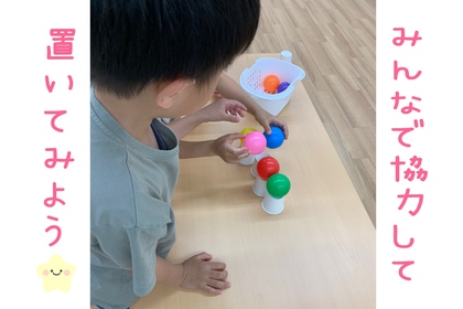 こんにちは🌞大分ルームです! 今回は、集団レッスンで行った活動の一つ、「置いてみよう」の様子をご紹介します(*^^*) まずは先生が並べたボールの順番をよく見て覚え、友だちと相談しながら正しく置...